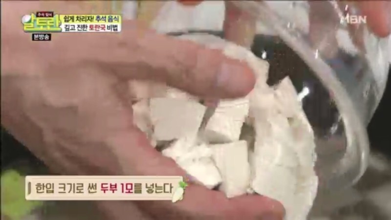 6. 한입 크기로 썬 두부 1모를 넣은 뒤, 이제 양념을 더할 차례입니다.