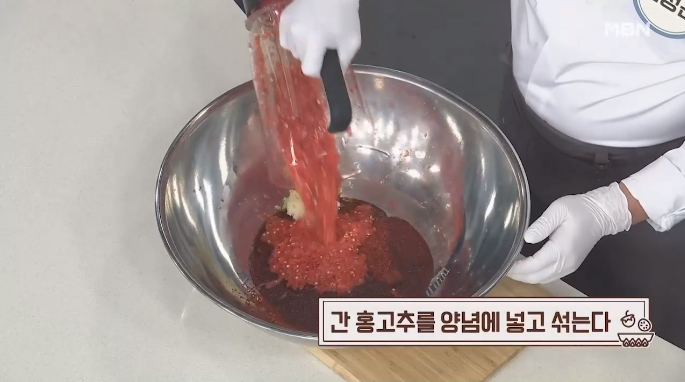 6. 갈아 놓은 홍고추를 양념에 넣고, 전체가 잘 어우러지도록 골고루 섞어주세요.