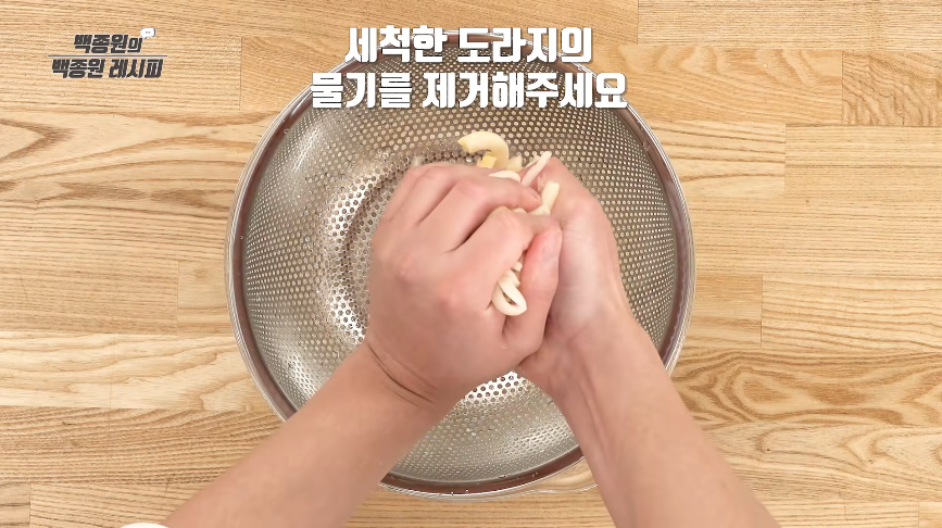 3. 쓴맛을 뺀 도라지는 흐르는 물에 잘 주물러가며 씻은 뒤, 물기를 제거해 주세요.