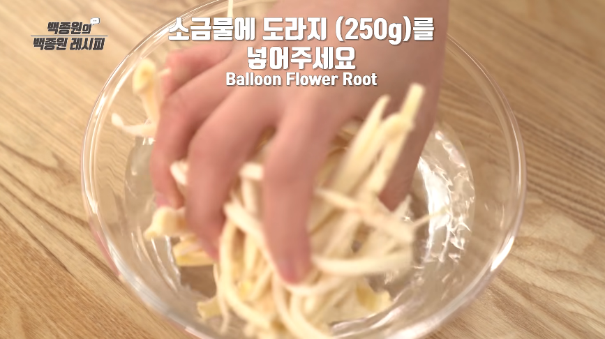 2. 소금물을 만들기 위해 꽃소금과 물을 잘 섞어 소금이 충분히 녹도록 한 뒤, 도라지를 넣고 약 1시간 정도 담가 쓴맛을 빼줍니다.