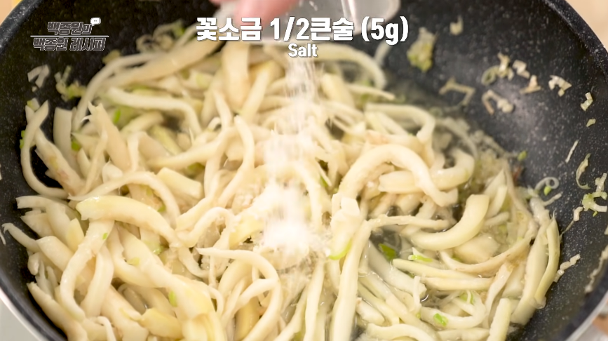 도라지나물 만드는 법에는 다른 방식도 있습니다. 파기름을 내는 대신, 도라지에 소금 등 모든 재료를 넣고 잘 주물러 뽀얀 물이 나오도록 한 다음, 그대로 팬에 넣고 볶는 방법도 있으니 취향에 따라 조리법을 선택하시면 됩니다.