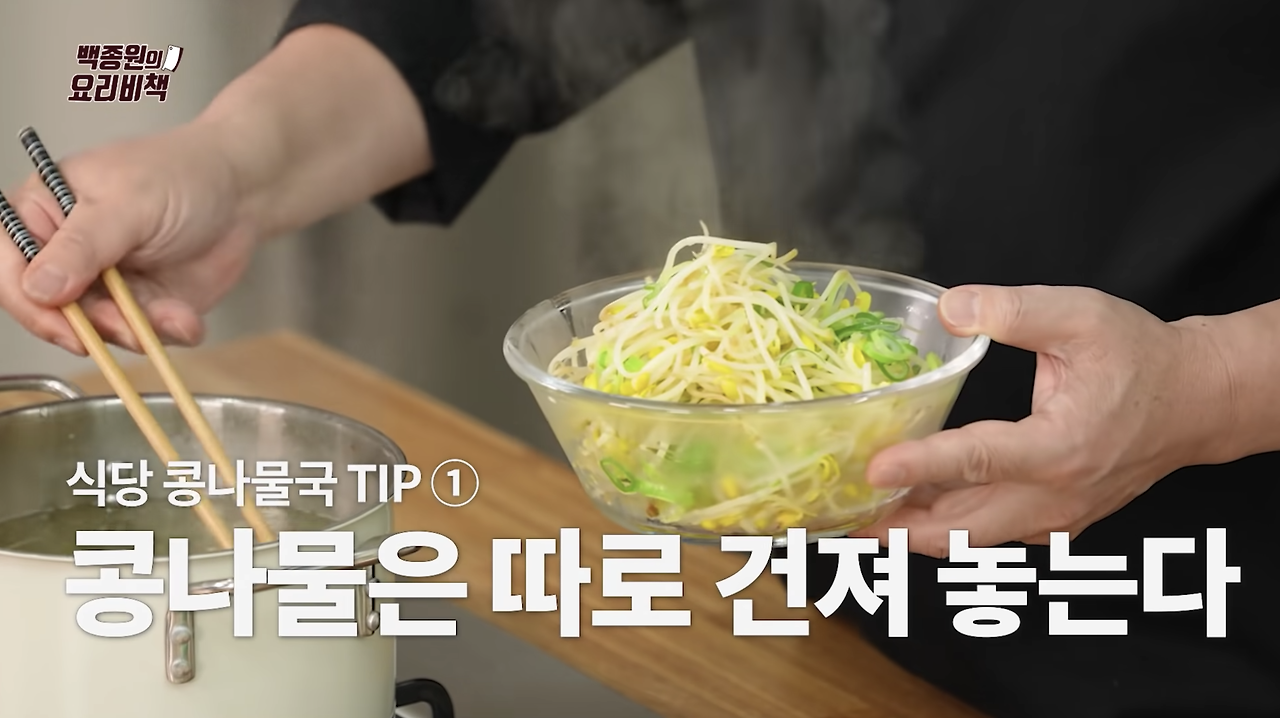 백종원 셰프가 알려준 식당 스타일의 콩나물국 비법은 국물과 건더기를 따로 사용하는 것이라고 합니다.