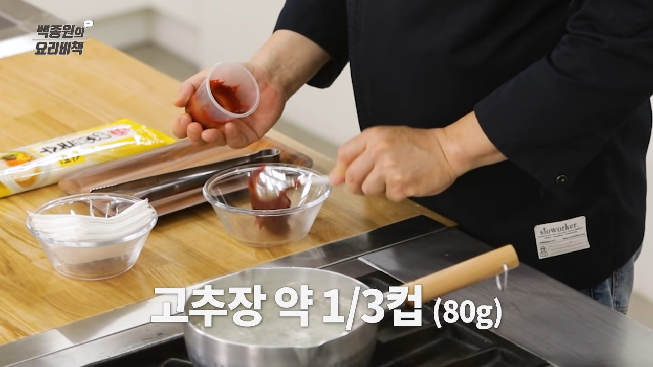 특히 인상 깊었던 건 '강식당2'에서 소개된, 고추장 없이 만드는 비빔국수였습니다. 그 레시피가 기억나시나요? 당시에는 다진 고기 2컵, 물 3컵, 다진 대파 500g, 설탕 3컵, 물엿 3컵, 진간장 6컵 등을 프라이팬에 넣고 끓인 뒤 식혀서 기름기를 제거했었죠. 이후 식힌 양념장에 배 2컵, 물 2컵, 간 마늘 1컵, 간 생강 1½숟가락, 고춧가루 560g, 후추 1½숟가락을 더해 비빔국수 양념장을 완성했습니다. 오늘 소개할 레시피는 이보다 훨씬 간단하게 만들 수 있습니다. 백종원의 비빔국수 황금레시피, 지금부터 하나씩 알아볼게요.