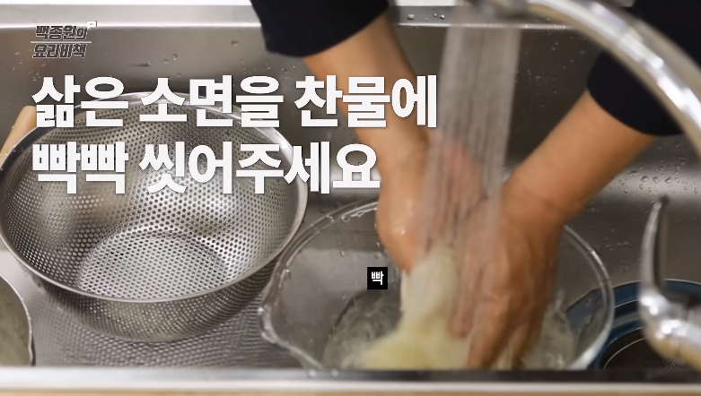 소면은 손으로 힘 있게 비벼 전분을 없애줘야 쫄깃하고 맛있다고 해요. 손빨래하듯 힘차게 비벼주세요.
