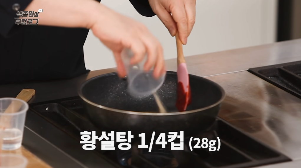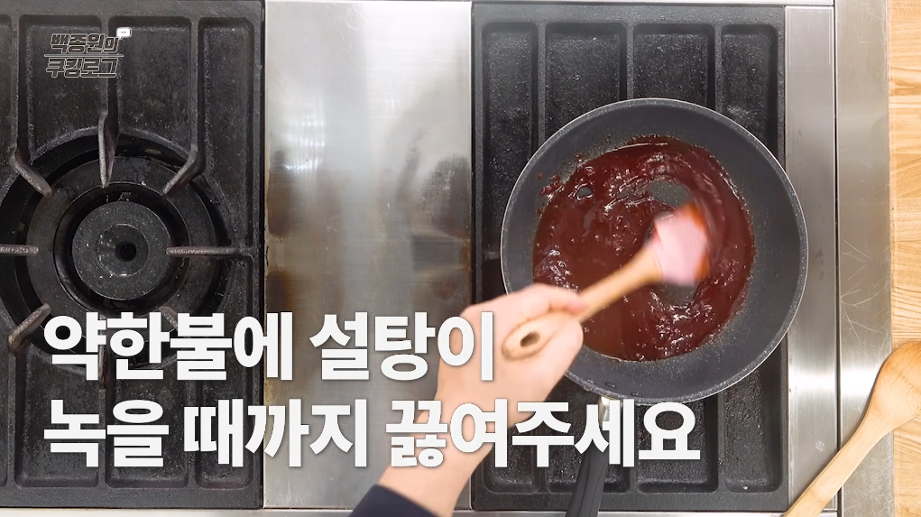 3. 이제 양념장을 만들 차례입니다. 프라이팬에 고추장, 고운 고춧가루, 물엿, 황설탕, 물을 넣고 잘 저으면서 설탕이 녹을 정도로 끓여주면 됩니다.