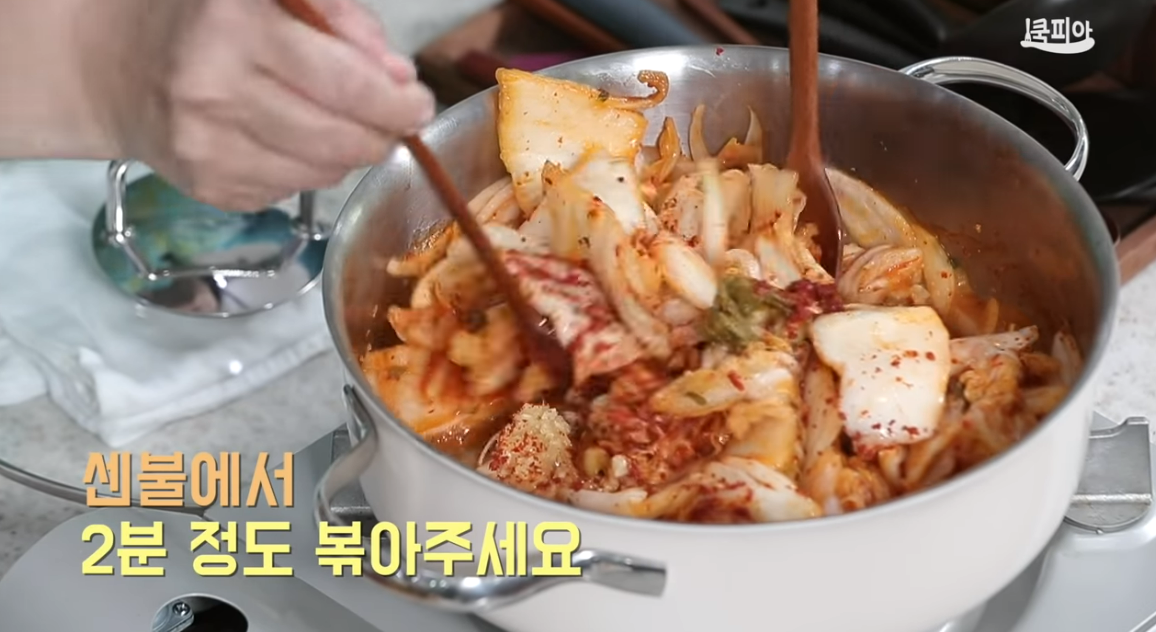 (3) 무쳐 놓은 배추김치를 냄비에 넣고 약 1분 정도 볶아 주세요.