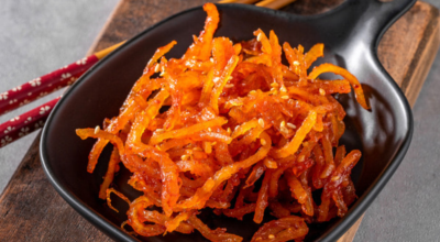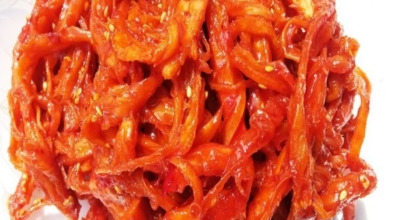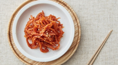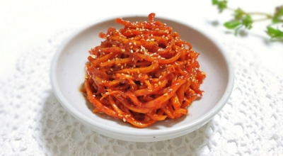 오징어채 또는 진미채라고 불리는데요, 이름처럼 오징어를 잘게 찢어 건조한 건어물의 한 종류입니다. 진미채는 설탕, 소금, 구연산 등의 첨가물을 넣어 건조시켜 달콤하면서도 짭조름한 맛을 내요. 진미채는 두 가지 종류로 나뉘는데, 홍진미채와 백진미채입니다. 홍진미채는 오징어 껍질을 벗기지 않아 붉은색을 띠고, 백진미채는 껍질을 벗겨 흰색을 띠는 것이 특징입니다.