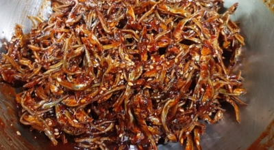 멸치: 200g, 식용유: 2큰술, 다진 마늘: 1큰술, 고추장: 1큰술, 설탕: 1큰술, 간장: 한 큰술, 참기름: 1작은술, 깨: 적당량 (선호에 따라 추가)