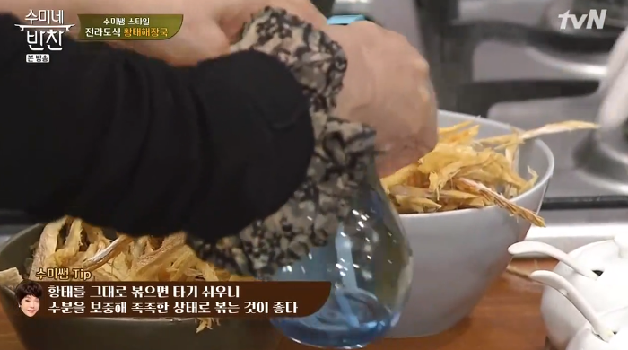 Tip. 황태를 그대로 볶으면 쉽게 탈 수 있어서, 김수미 선생님은 수분을 보충해 촉촉한 상태로 만든 뒤에 볶아주신다고 해요.