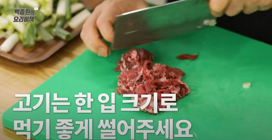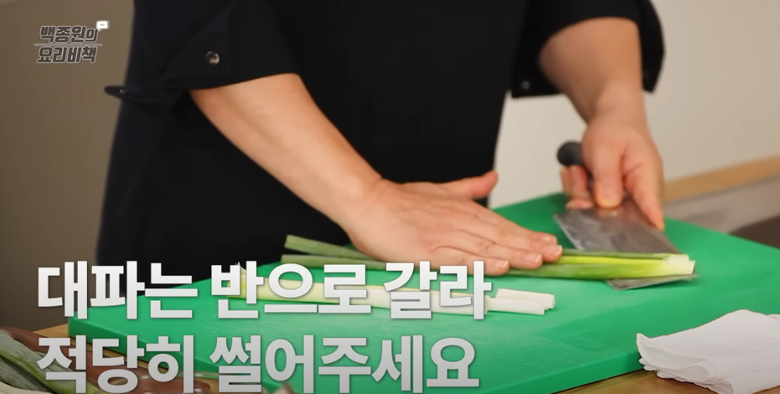 대파는 반으로 갈라 약 5cm 길이로 적당히 썰어주세요. 이때 일부는 남겨 송송 썰어 고명용으로 따로 준비합니다.