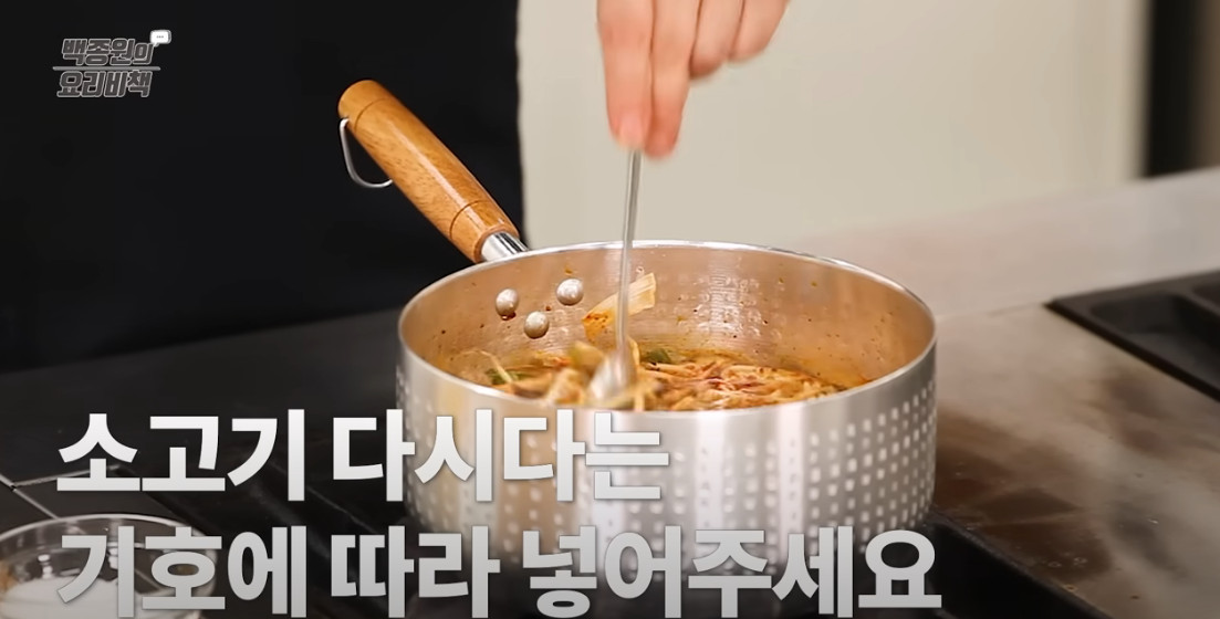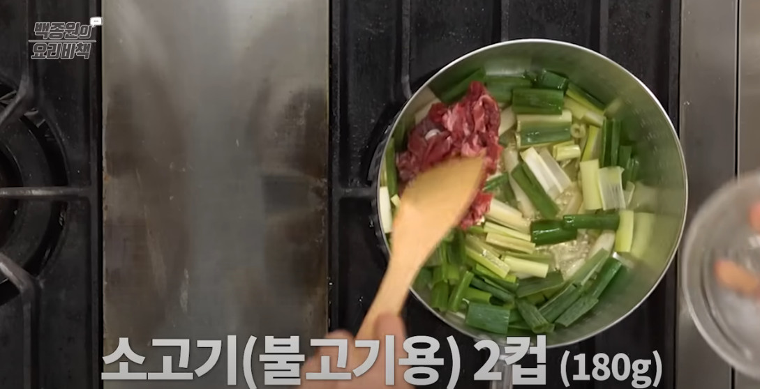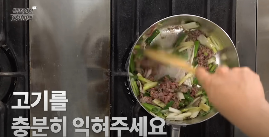 파 향이 기름에 충분히 배면 소고기를 넣습니다. 볶으면서 고기를 잘 펼쳐 충분히 익혀주세요. 기름기가 있는 부위가 더 고소한 맛을 냅니다.